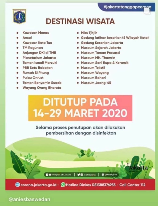 “Sebagai pencegahan penyebaran COVID-19, Pemprov DKI menutup seluruh destinasi wisata dan tempat hiburan milik Pemprov DKI Jakarta selama dua pekan,” tulis Anies Baswedan di halaman Facebook pribadinya, Sabtu (14/3/2020).