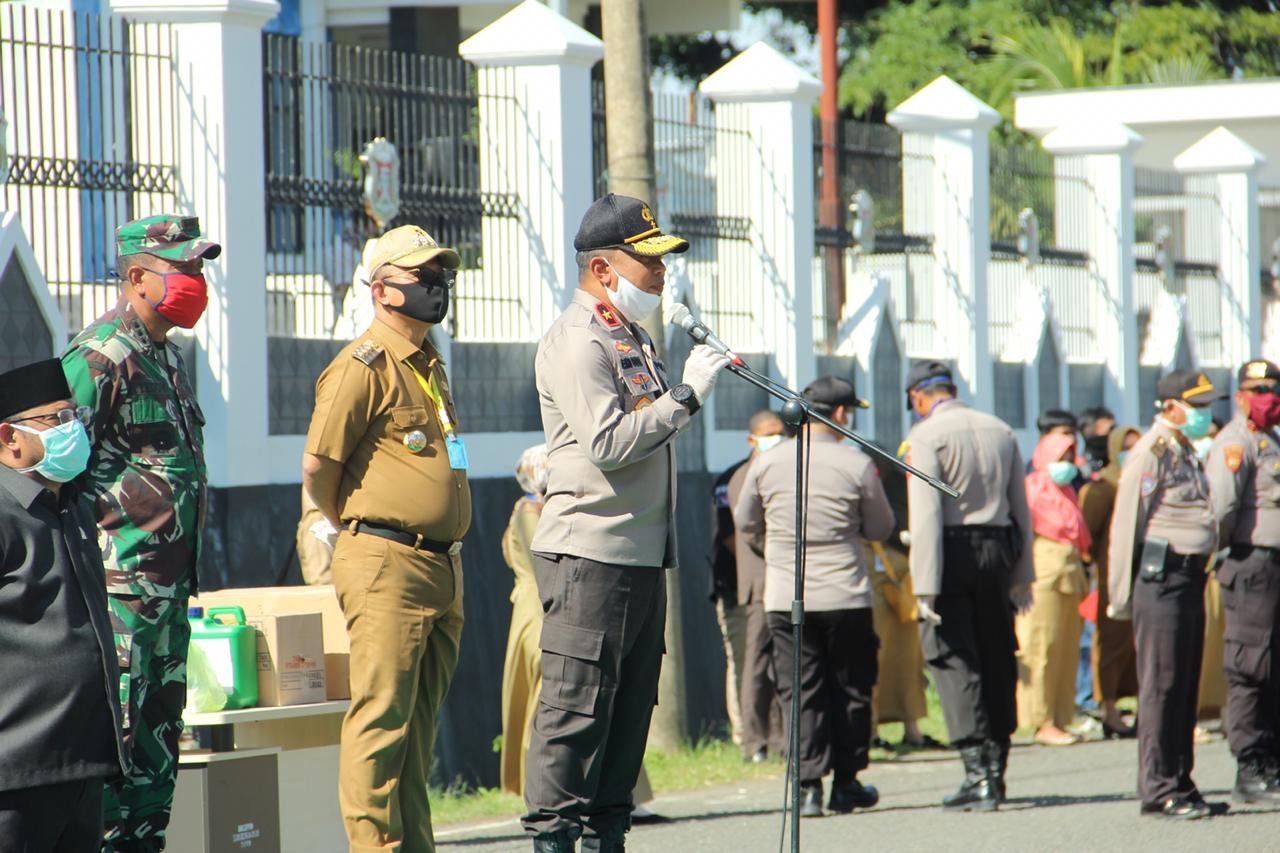 MAMUJU, MEDIAEKSPRES.id – Kepala Kepolisian Daerah (Kapolda) Provinsi Sulawesi Barat (Sulbar), Brigjen Pol Eko Budi Sampurno, memimpin langsung Apel Siaga “Seruan Gerakan Memakai Masker Serentak Se-Kabupaten Mamuju” sebagai langkah percepatan penanganan Covid-19. Kegiatan tersebut dilanjutkan dengan pembagian Alat Kesehatan (Alkes) berupa masker dan vitamin serta penyemprotan disinfektan serentak hingga ke tingkat desa, Senin (13/04/20).