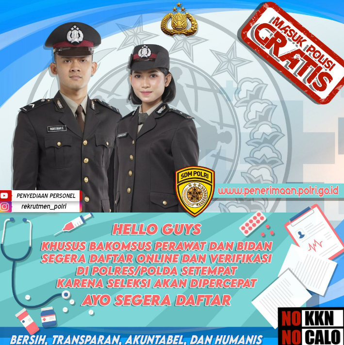 “Penerimaan anggota Polri khusus perawat dan bidan akan berbeda dengan penerimaan anggota Polri lainya yang mengalami pengunduran berdasarkan perintah Asisten SDM Mabes Polri, Irjen Pol Eko Indra Heri melalui video conference bahwa penerimaan Bintara khusus perawat dan bidan akan tetap dilaksanakan walau ditengah kondisi pandemic virus covid19,” tuturnya.