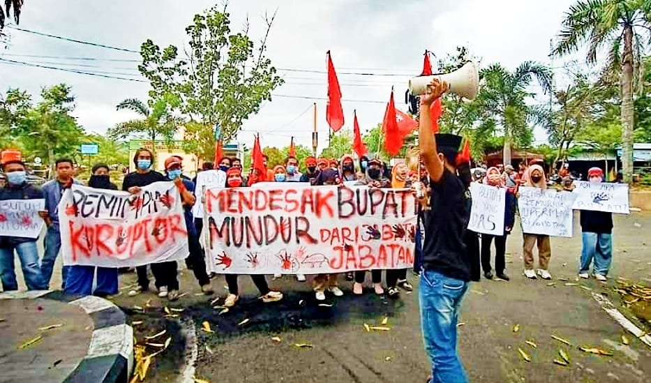 Dalam aksi tersebut, pihaknya membentangkan spanduk bertuliskan “Mendesak bupati mundur dari jabatannya.”