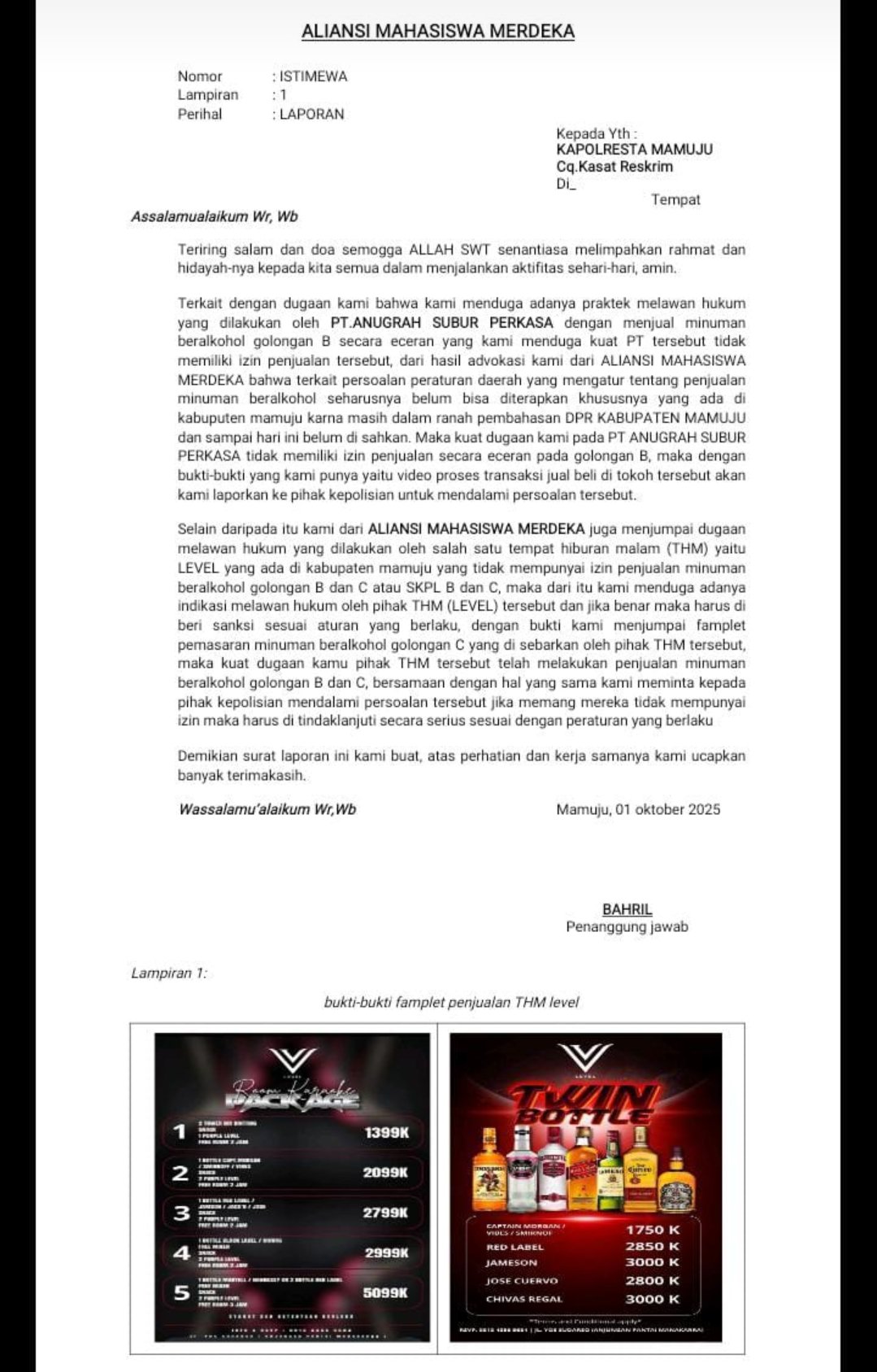 Menurut laporan yang diserahkan, THM Level disebut-sebut menjual minuman golongan B dan C tanpa mengantongi Surat Keterangan Penjualan Langsung (SKPL) sebagaimana diwajibkan peraturan. Tak main-main, mahasiswa mengaku memiliki bukti berupa pamflet promosi minuman keras yang diduga beredar di tempat hiburan tersebut.